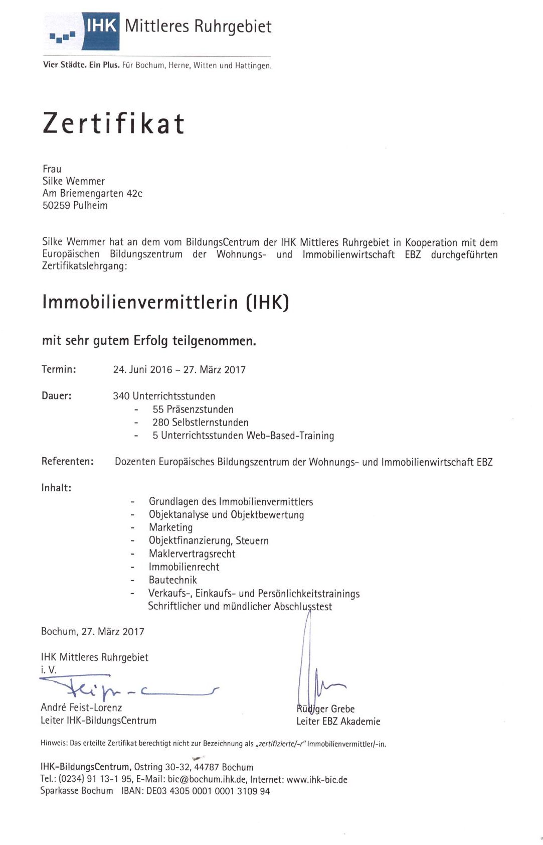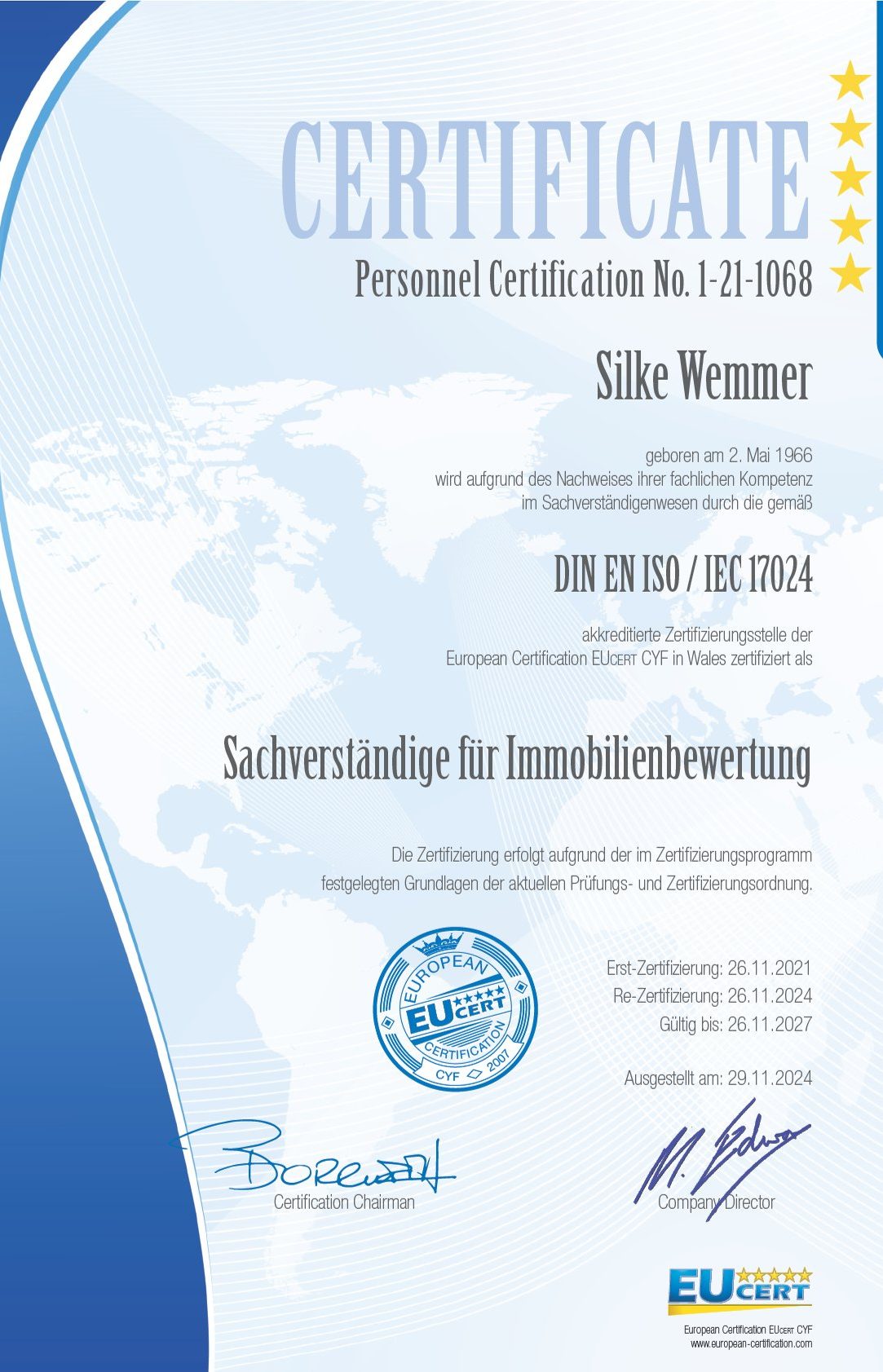Ich bin Sachverständige im Immobilien- und Grundstückswesen und verfüge über eine Personenzertifizierung nach DIN EN ISO/IEC 17024. Als IHK‑geprüfte Immobilienvermittlerin verbinde ich fachliche Präzision mit umfassender Marktkenntnis und einem tiefen Verständnis für die Immobilienbranche.