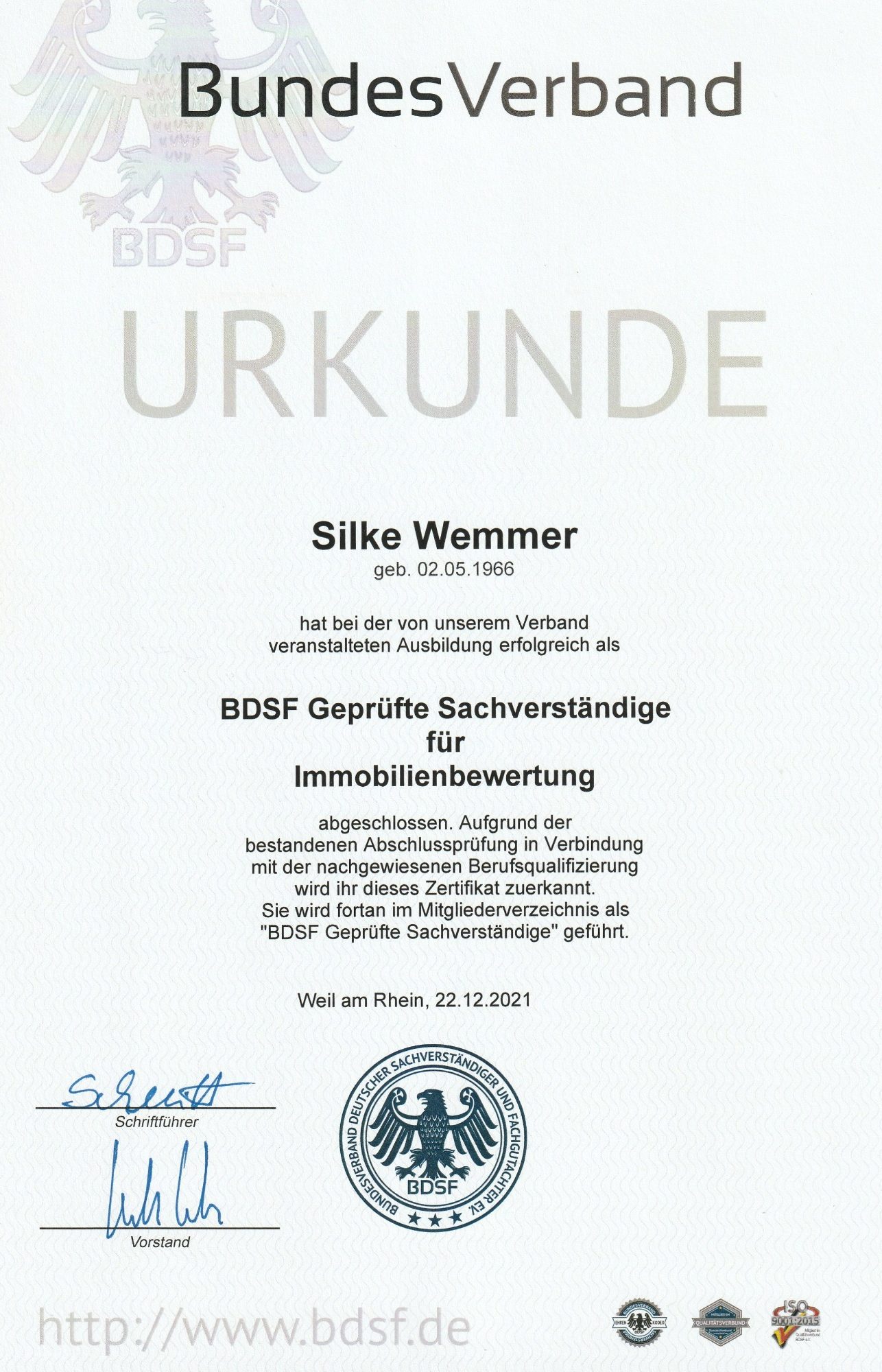 Seit über zehn Jahren arbeite ich erfolgreich als Immobilienmaklerin und habe in dieser Zeit zahlreiche Verkaufs- und Vermittlungsprozesse begleitet. Vor fünf Jahren habe ich meine Expertise erweitert und mich auf die Immobilienbewertung als Gutachterin spezialisiert. Meine Gutachten zeichnen sich durch Objektivität, Transparenz und höchste Sorgfalt aus – Werte, die mir besonders wichtig sind. Ich unterliege dem Ehrenkodex des Bundesverbands Deutscher Sachverständiger und Fachgutachter e.V. (BDSF) und bin dort Senior-Mitglied.